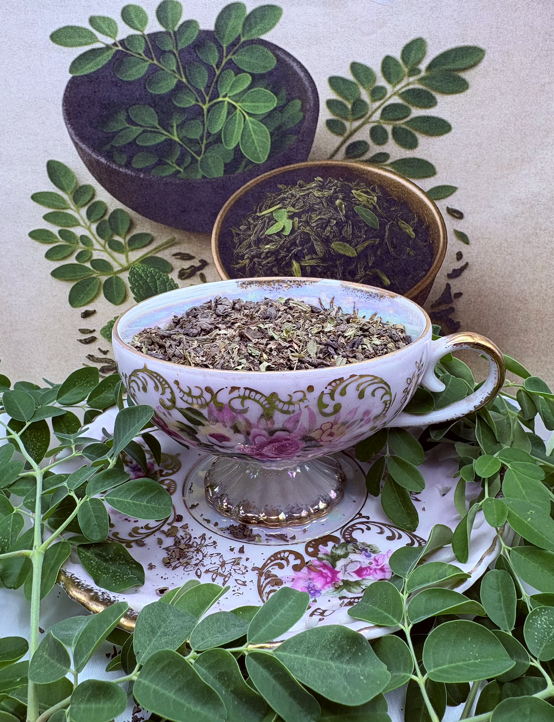 A refreshing, balancing Ayurvedic blend to awaken your senses and nourish your spirit. This majestic infusion combines moringa, gunpowder green tea, sencha, jasmine and mint - harmonizing vitality with tranquility in every sup. Perfect for moments of focus, calm, or gentle renewal. Brew, breathe and let nature’s intelligence work its quiet magic.